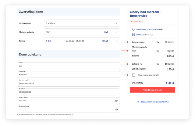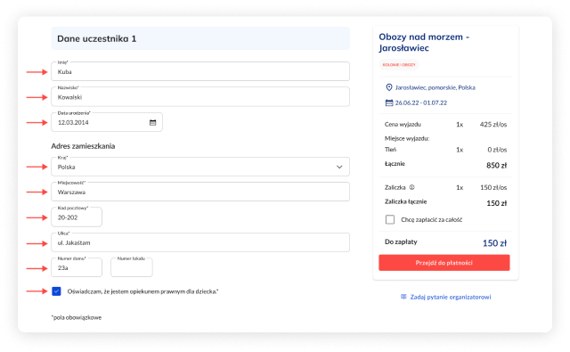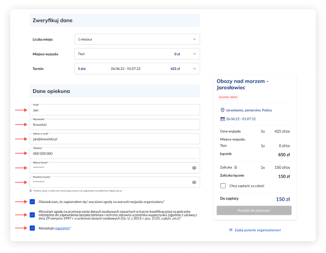 Verify and PaySelect a trip offer for your child and complete the simple booking form. Make sure that the basic parameters such as date, number of participants, and departure location are correct. Fill in your first name, last name, and basic contact details.