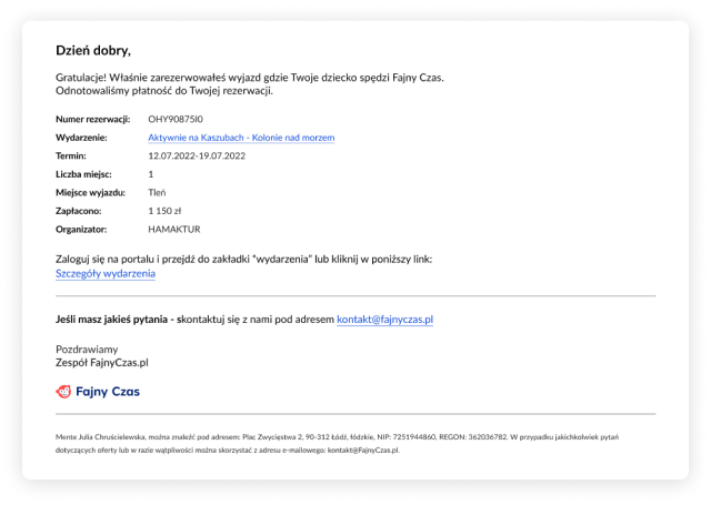 You will receive a summary of your order to the email address provided by you. At the same time, the Organizer will receive information about your order along with contact details. If only a deposit has been paid, we will inform you about the remaining payment approximately 5 days before the deadline. You will receive another email the day before, unless the reservation has been paid in full earlier.